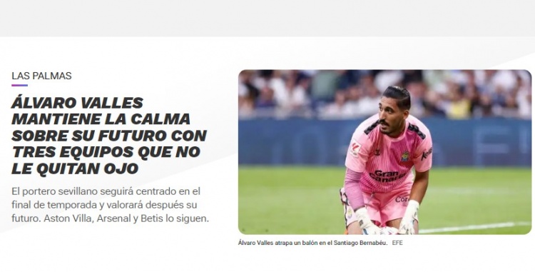 3月14日消息 据西班牙媒体relevo报道,阿森纳、阿斯顿维拉等队关注拉斯帕尔马斯门将瓦尔莱斯。