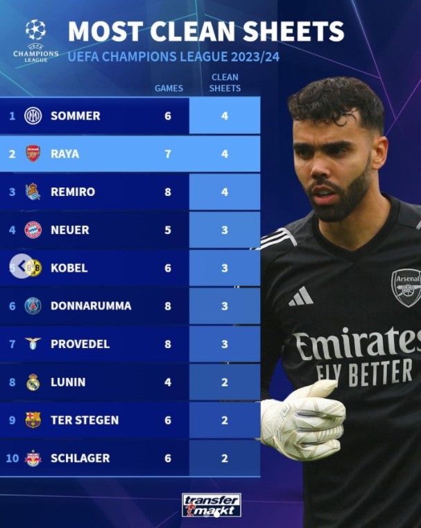 3月14日消息 德国转会市场网官方社媒统计了本赛季欧冠零封次数榜,索默、拉亚、雷米罗均4次零封。