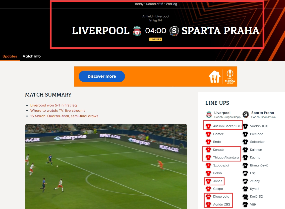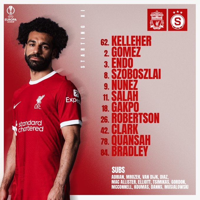 正确首发:首回合5-1大胜!利物浦vs布拉格斯巴达:努涅斯萨拉赫远藤航先发