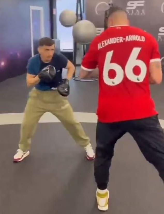 3月16日消息 在一段托雷斯练习拳击的视频中,他在训练时穿着印有阿诺德名字的利物浦球衣。