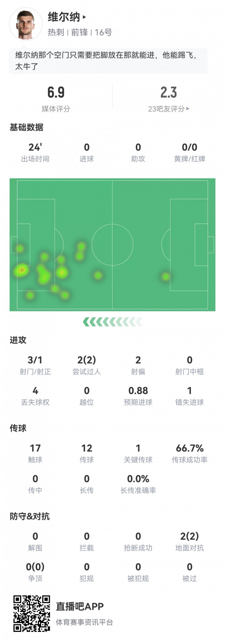 3月17日消息 本轮英超热刺0-3客负富勒姆,维尔纳替补登场24分钟有一次离谱失空门的表现,球员全场重点数据如下↓
