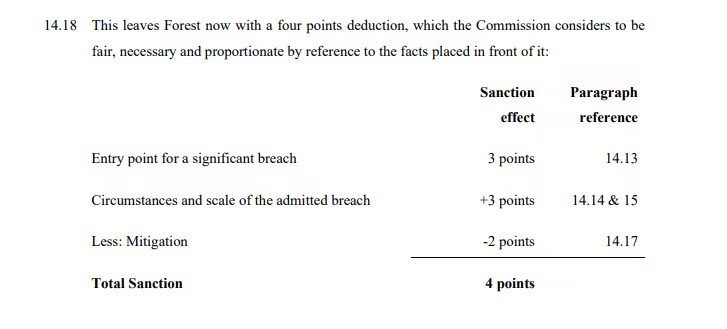 诺丁汉森林对委员会立即对俱乐部施加四分处罚的决定感到极度失望。尽管我们感到失望,但我们感谢委员会同意在迅速处理此事。俱乐部认为,解决在发生的赛季内提出的指控,对于联赛的诚信至关重要。