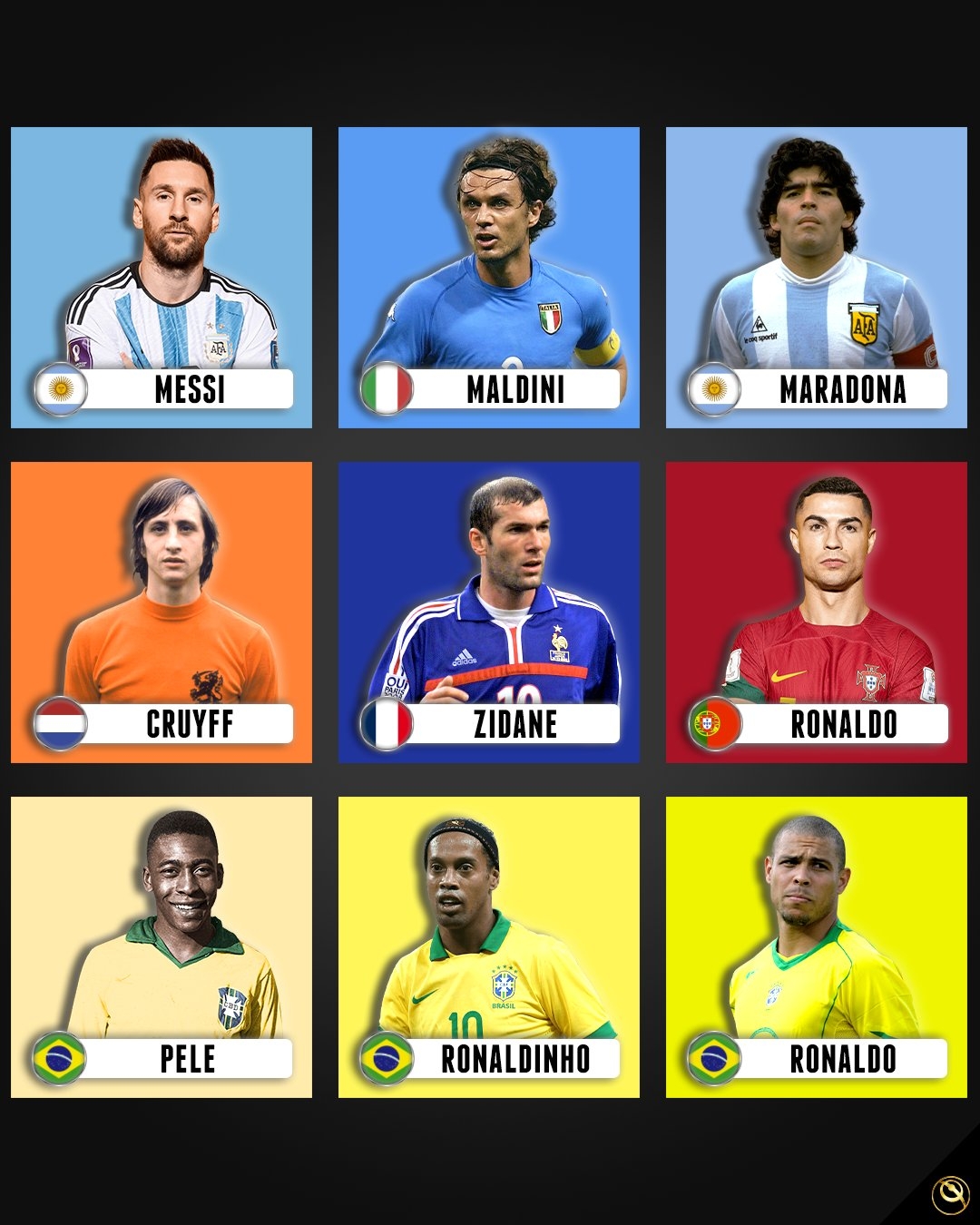 外媒发布了九大传奇球星海报,分别为贝利、马拉多纳、克鲁伊夫、大罗、小罗、齐达内、马尔蒂尼、梅西、C罗。