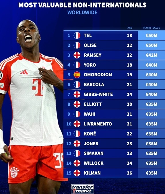 3月26日消息 《转会市场》在今日统计了尚未在国家队首秀的球员身价榜,英格兰和法国包揽前15中的14席。