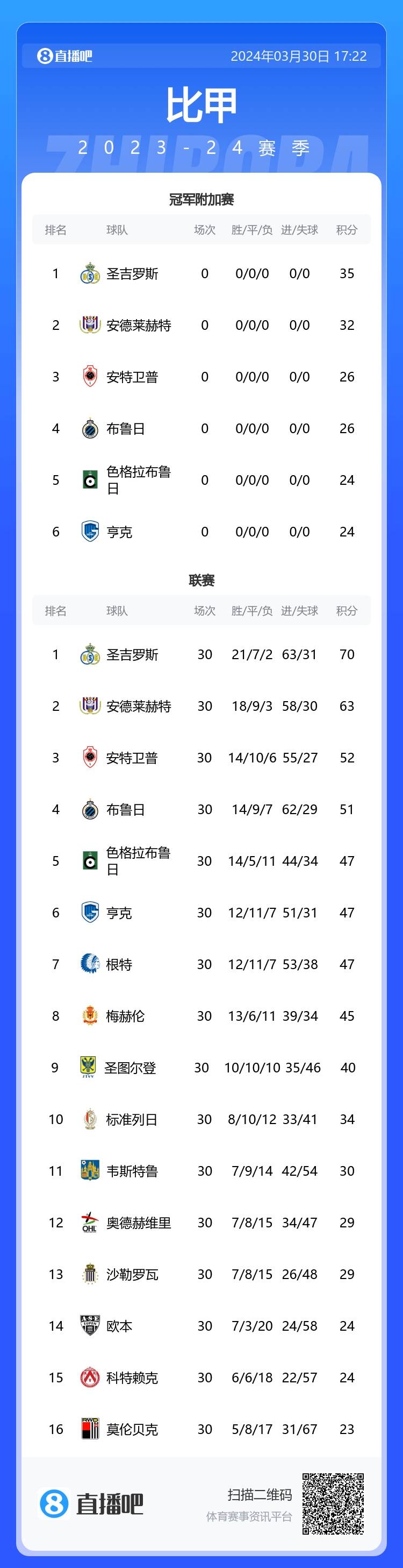 比甲常规赛积分榜(前6晋级冠军附加赛,第7-12进行欧协联附加赛,第13-16进行降级附加赛)↓