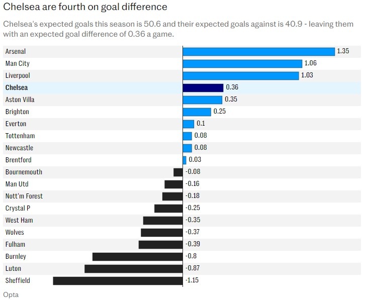 另一方面,切尔西本赛季的预期进球数为50.6,预期丢球数40.9,每场比赛预期净胜球为0.36,在英超联赛中排名第四,仅次阿森纳、曼城和利物浦。