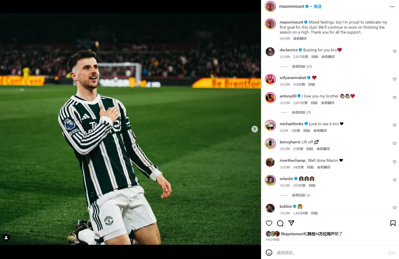 3月31日消息 英超第30轮,曼联客场1-1战平布伦特福德,此前遭遇长期伤病的芒特终于在补时收获了红魔处子球,遗憾的是球队随后被绝平。