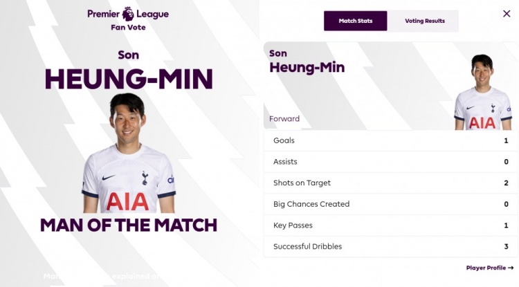 3月31日消息 英超第30轮,热刺主场2-1逆转击败卢顿,孙兴慜在第86分钟打进绝杀制胜球。赛后,他也获得了球迷80.4%的投票,以绝对优势当选全场最佳球员。