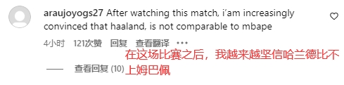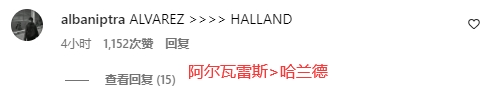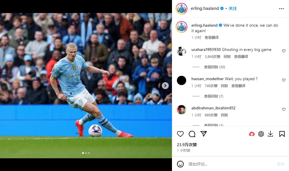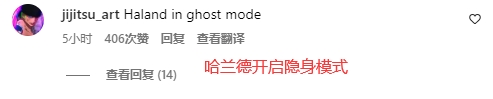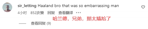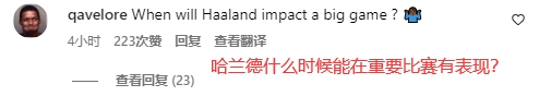 本场比赛曼城前锋哈兰德4次射门0射正,还浪费了一个近在咫尺的机会,赛后在他本人和曼城官方的社媒下面都有球迷对他的表现感到不满。