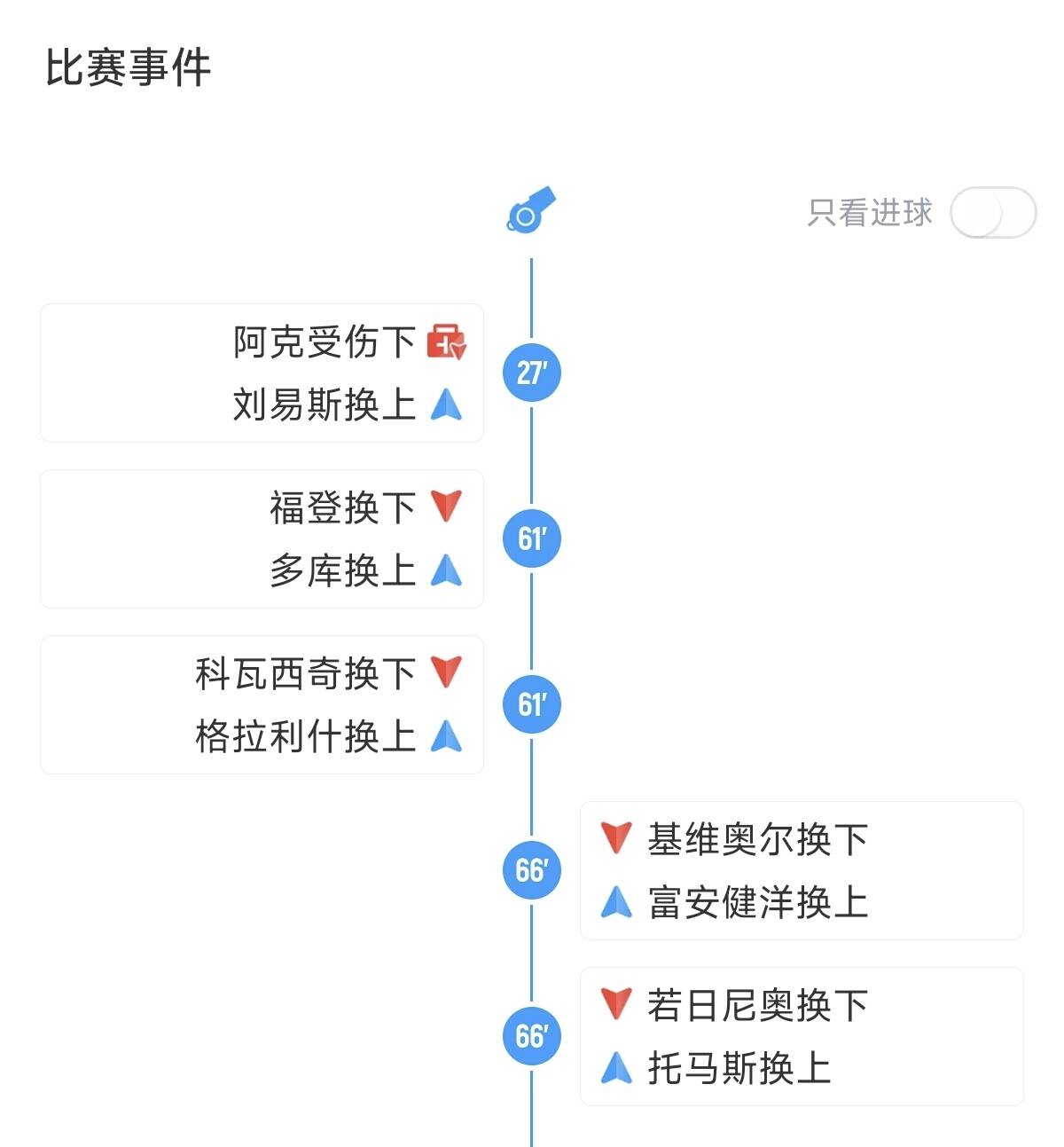 比赛第66分钟,基维奥尔、若日尼奥被换下,富安健洋、托马斯替补登场。
