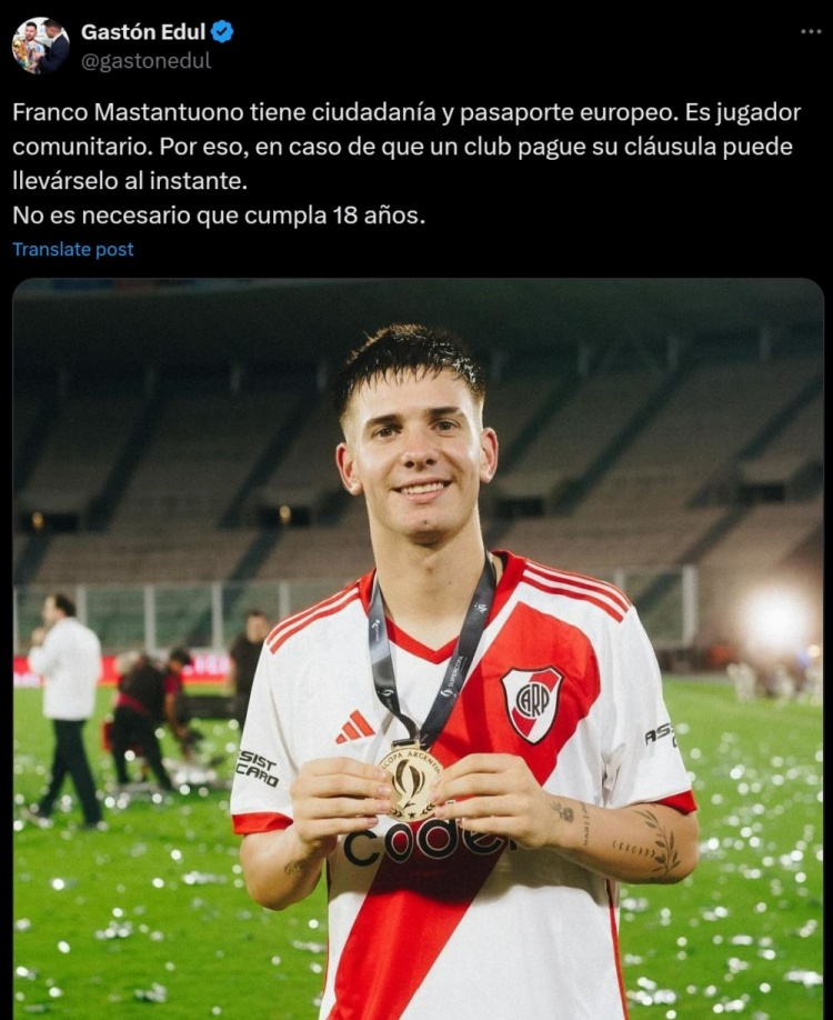 4月3日消息 据阿根廷记者Gaston Edul报道,16岁的河床中场马斯坦托诺有欧洲公民身份和护照。因此,如果有欧洲俱乐部想签下这名小将,就可以直接激活违约金,立刻带走球员,无需等到他年满18周岁。