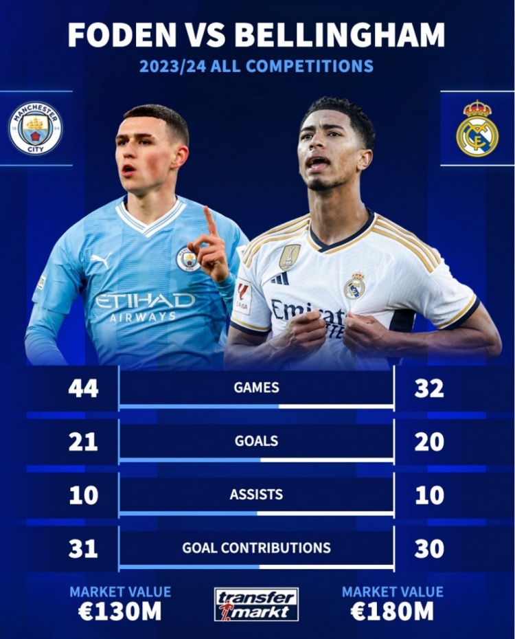 2023-24赛季各项赛事福登vs贝林厄姆数据:
