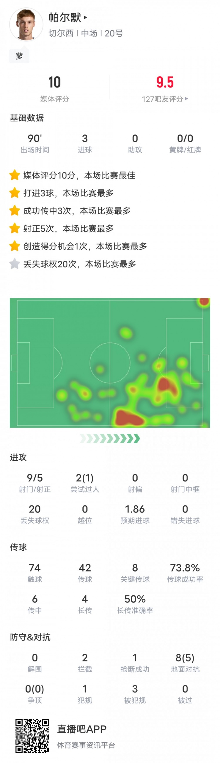 4月5日消息 在今日凌晨进行的一场英超联赛中,切尔西4-3曼联。本场比赛帕尔默首发出战,上演帽子戏法,另外他还送出8次关键传球,获评10分全场最高。