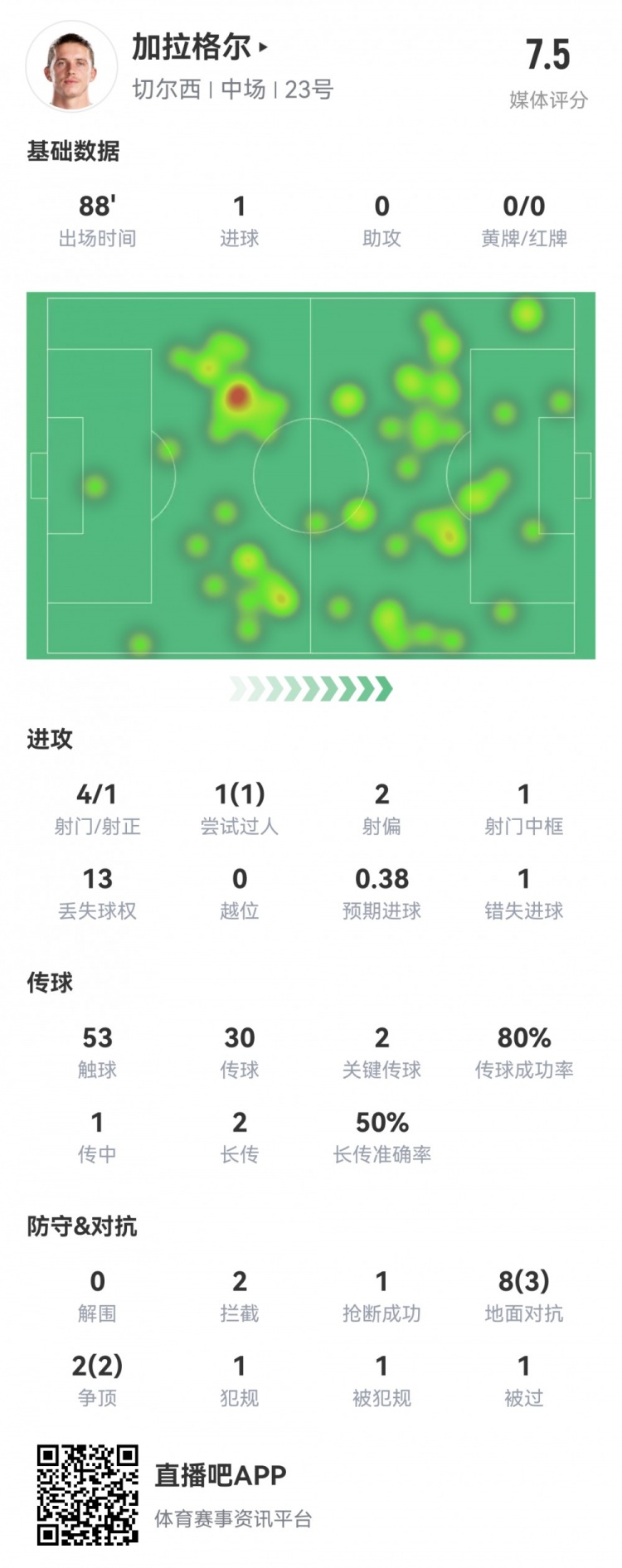 4月5日消息 本轮英超曼联暂3-2切尔西,加拉格尔闪击破门,球员全场重点数据如下↓