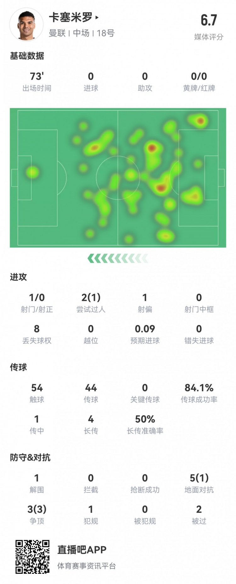 本场比赛,卡塞米罗有1次射门,2次过人1次成功;防守方面1次解围,5次地面对抗1次成功,3次空中对抗全部成功,1次犯规2次被过,评分6.7分。