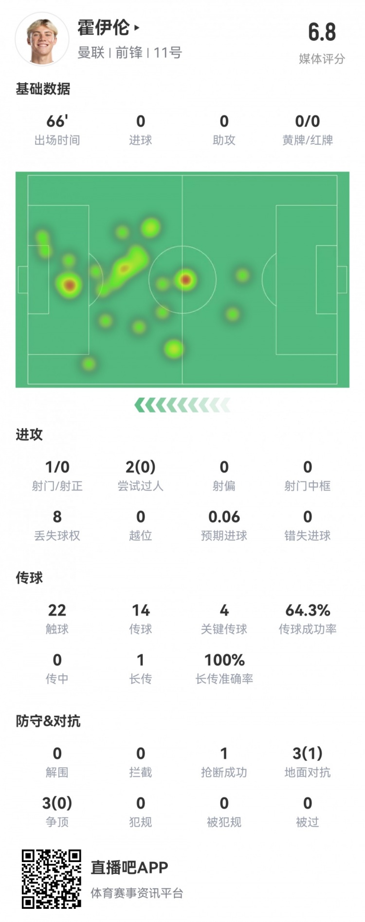 4月5日消息 本轮英超焦点战,切尔西暂2-3曼联。此役霍伊伦首发出战66分钟被换下,球员全场重点数据如下↓