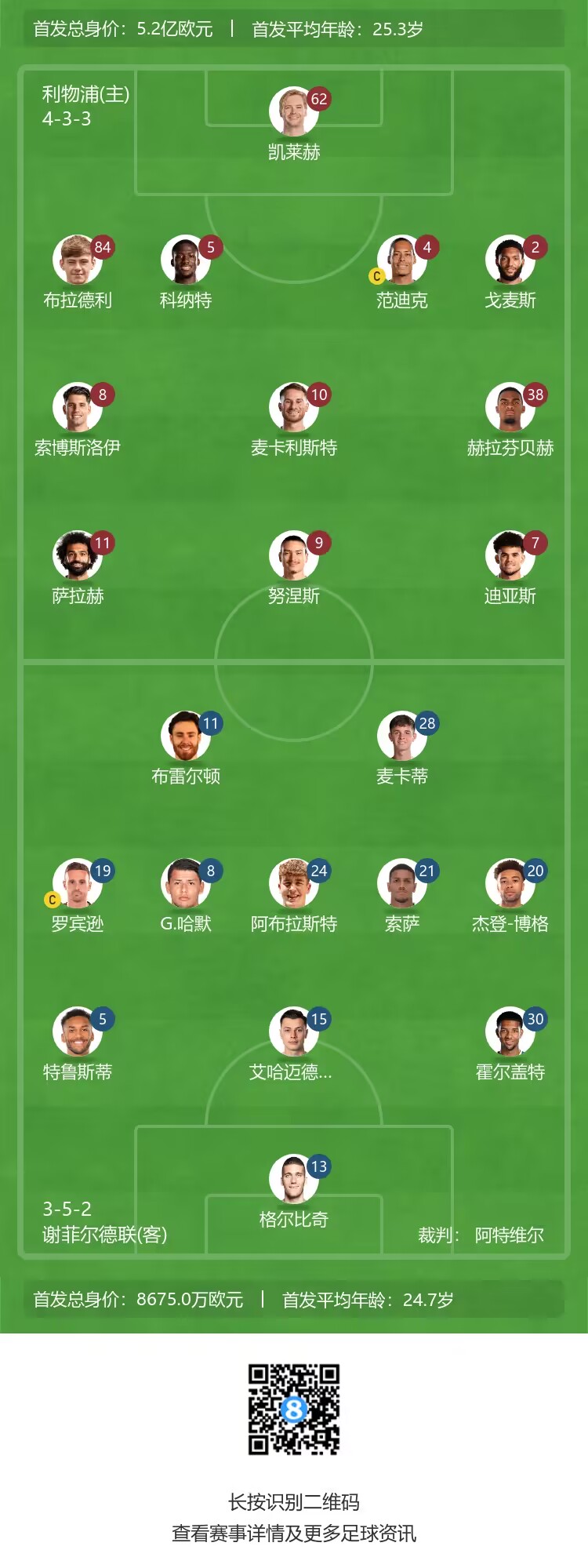 利物浦首发:62-凯莱赫、84-布拉德利、5-科纳特、4-范迪克、2-乔-戈麦斯、10-麦卡利斯特、8-索博斯洛伊、38-赫拉芬贝赫、11-萨拉赫、7-路易斯-迪亚斯、9-努涅斯