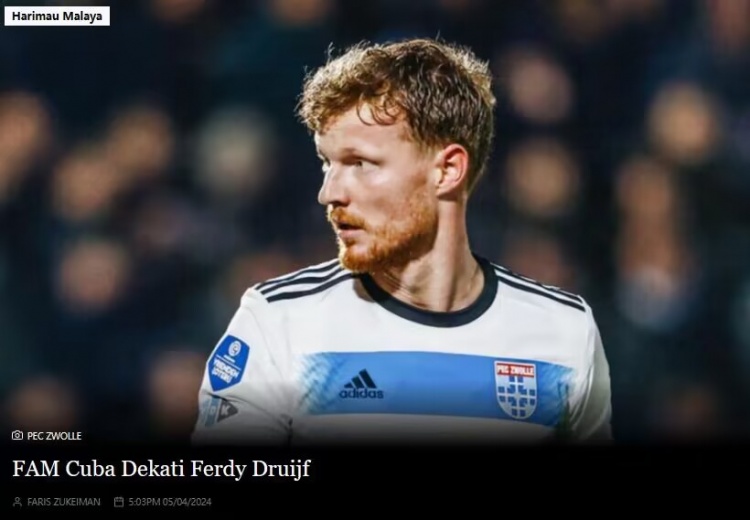 4月6日消息 马来西亚媒体Makanbola报道,马来西亚足协正在尝试归化兹沃勒前锋费迪-德鲁伊夫。
