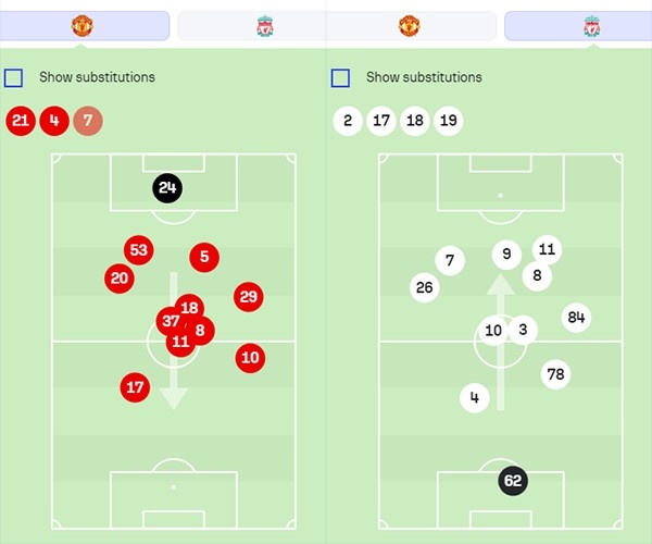 Sofascore的平均站位显示,曼联仅加纳乔和拉什福德两人过了半场,利物浦则是只有两名中卫和门将(范迪克、宽萨、凯莱赫)没过半场。