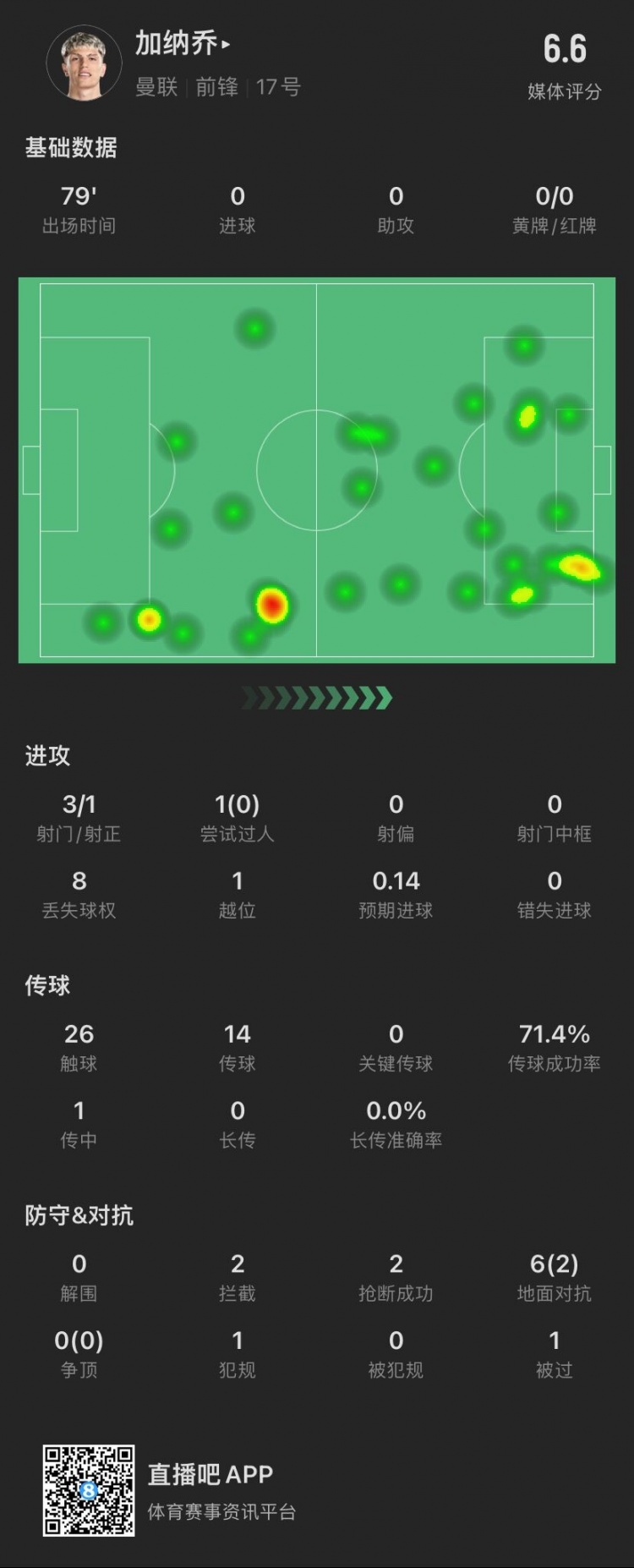 4月8日消息 在刚刚结束的英超本轮焦点战中,曼联主场2-2战平利物浦。本场比赛,加纳乔首发出战,第79分钟被换下场,获评Sofascore6.6分的评分。