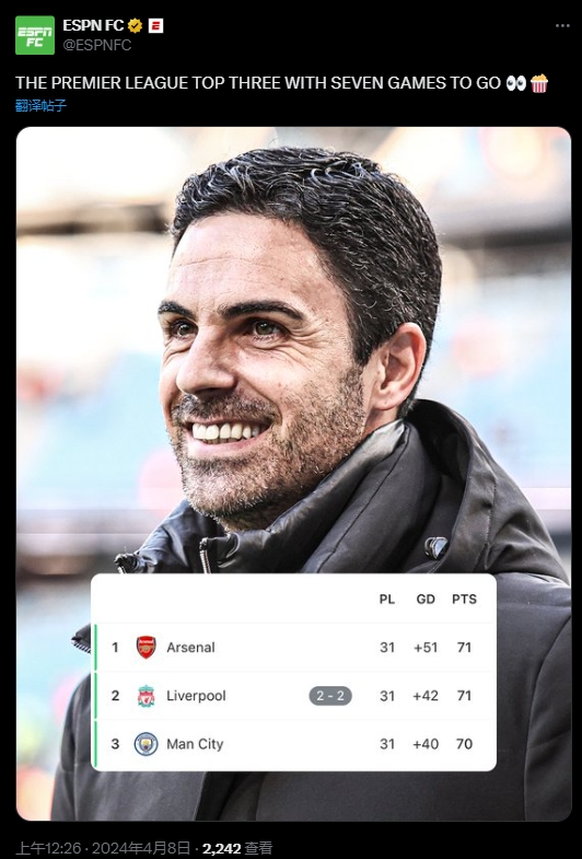 ????真正赢家?双红会战平,ESPN晒阿尔特塔微笑照片+积分榜