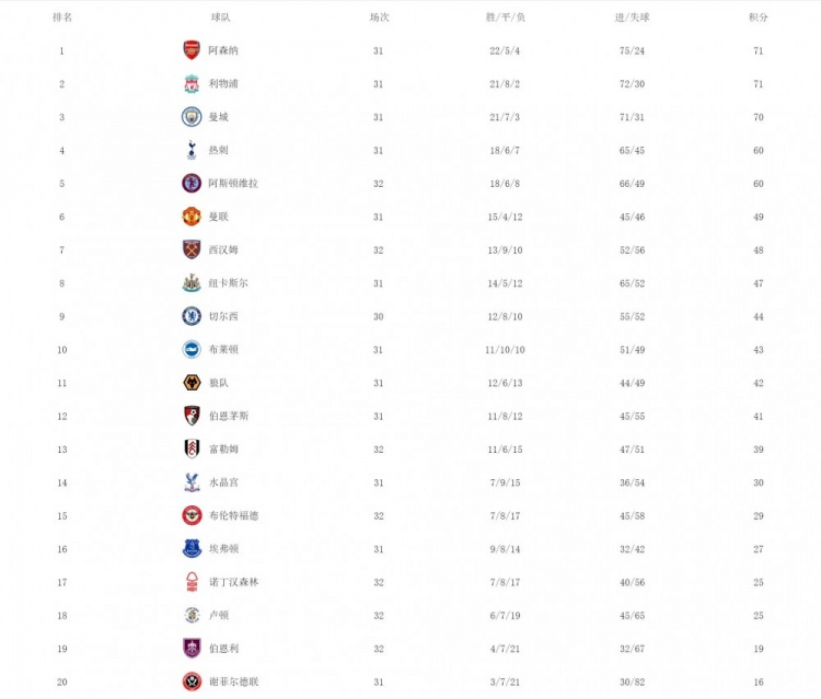 附英超当前积分榜: