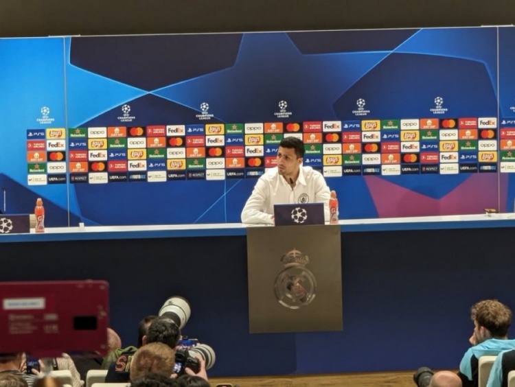 4月9日消息 欧冠1/4决赛首回合曼城vs皇马,赛前,曼城中场罗德里出席新闻发布会。