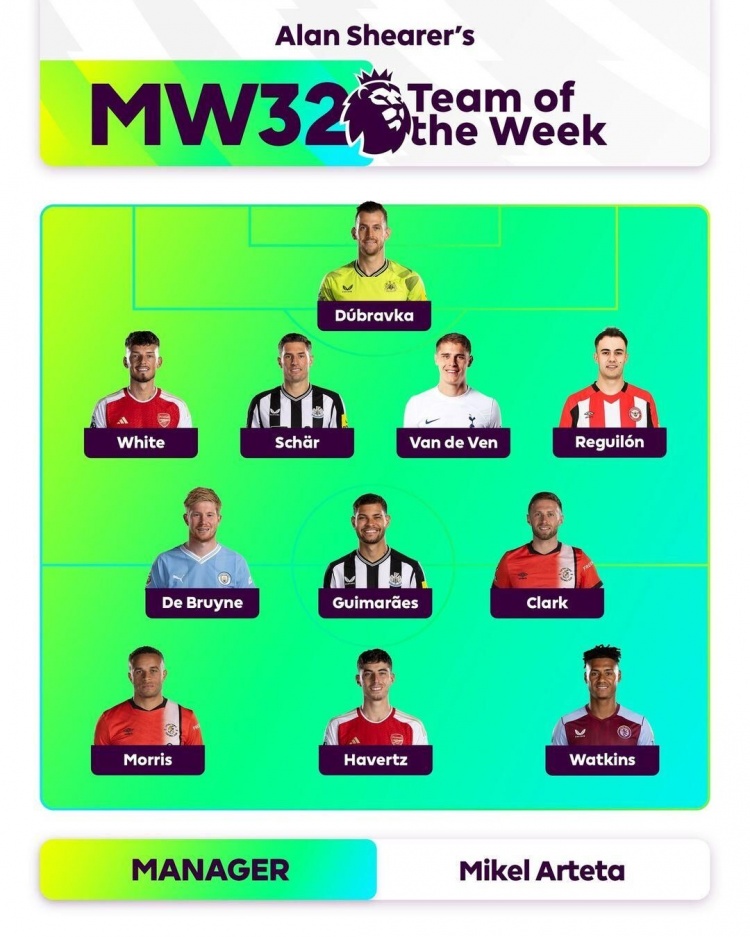 4月9日消息 英超第32轮比赛已经全部结束,阿兰-希勒评选出了本轮的最佳阵容,其中,德布劳内领衔,哈弗茨、吉马良斯、沃特金斯等人入选,阿尔特塔为最佳教练。