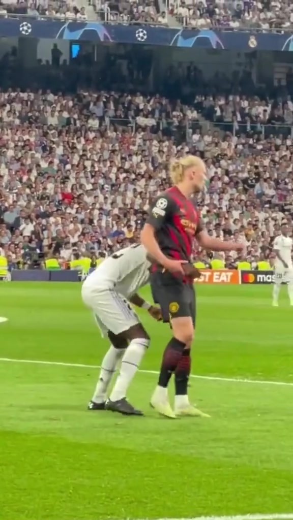 这一幕似曾相识, 去年欧冠半决赛首回合,曼城1-1皇马,吕迪格也曾这样防过哈兰德。