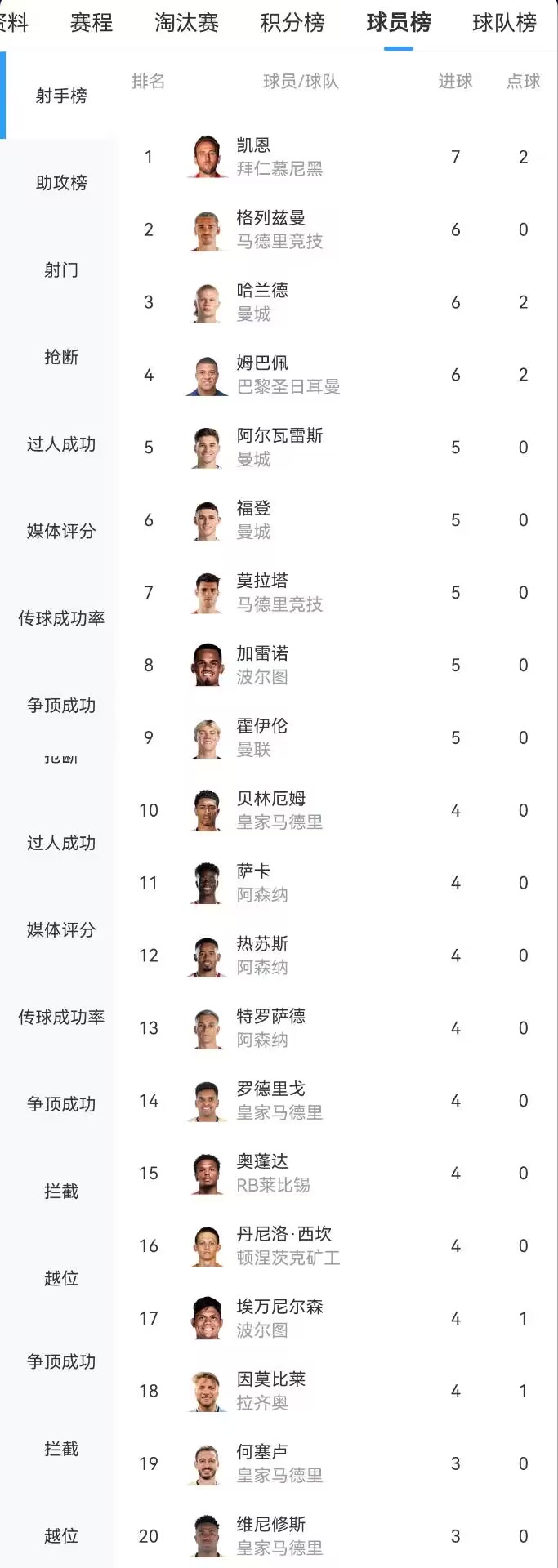 凯恩点射破门后,以7球独占射手榜第一,格列兹曼、哈兰德和姆巴佩均打入6球紧随其后。福登、阿尔瓦雷斯等人打入5球。具体射手榜前20如下↓