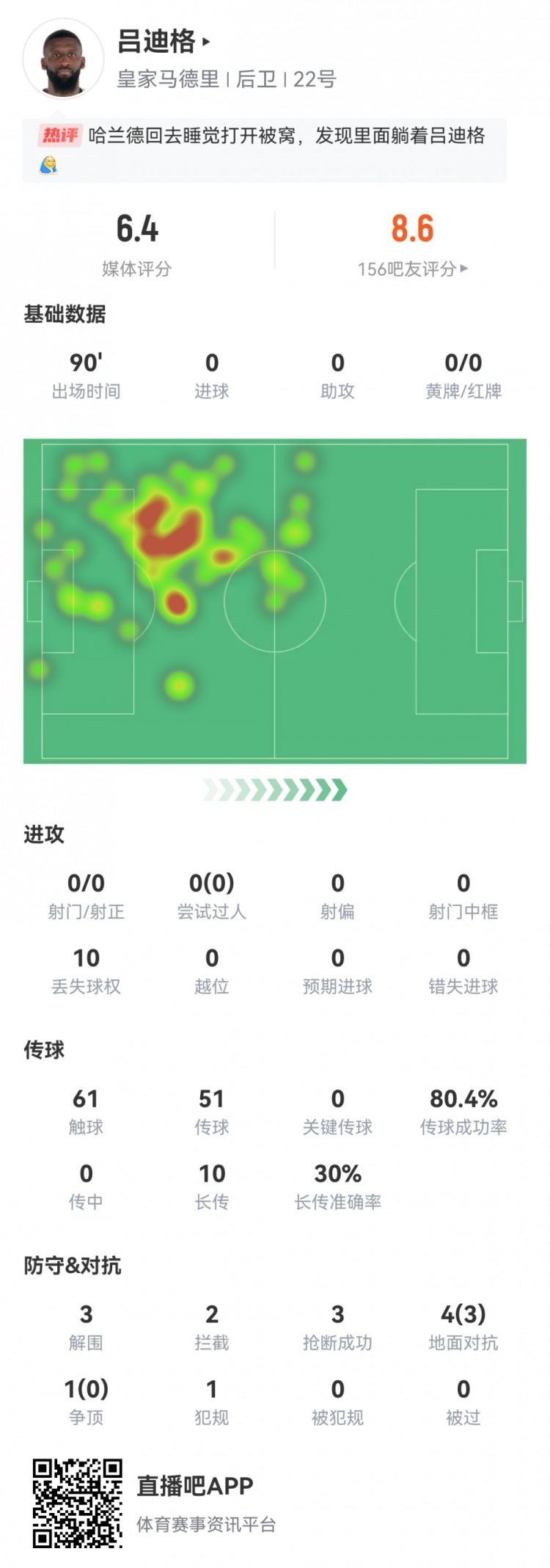 4月10日消息 欧冠1/4决赛首回合,皇马主场3-3曼城。此役吕迪格首发打满全场,全力盯防限制哈兰德发挥,球员全场重点数据如下↓