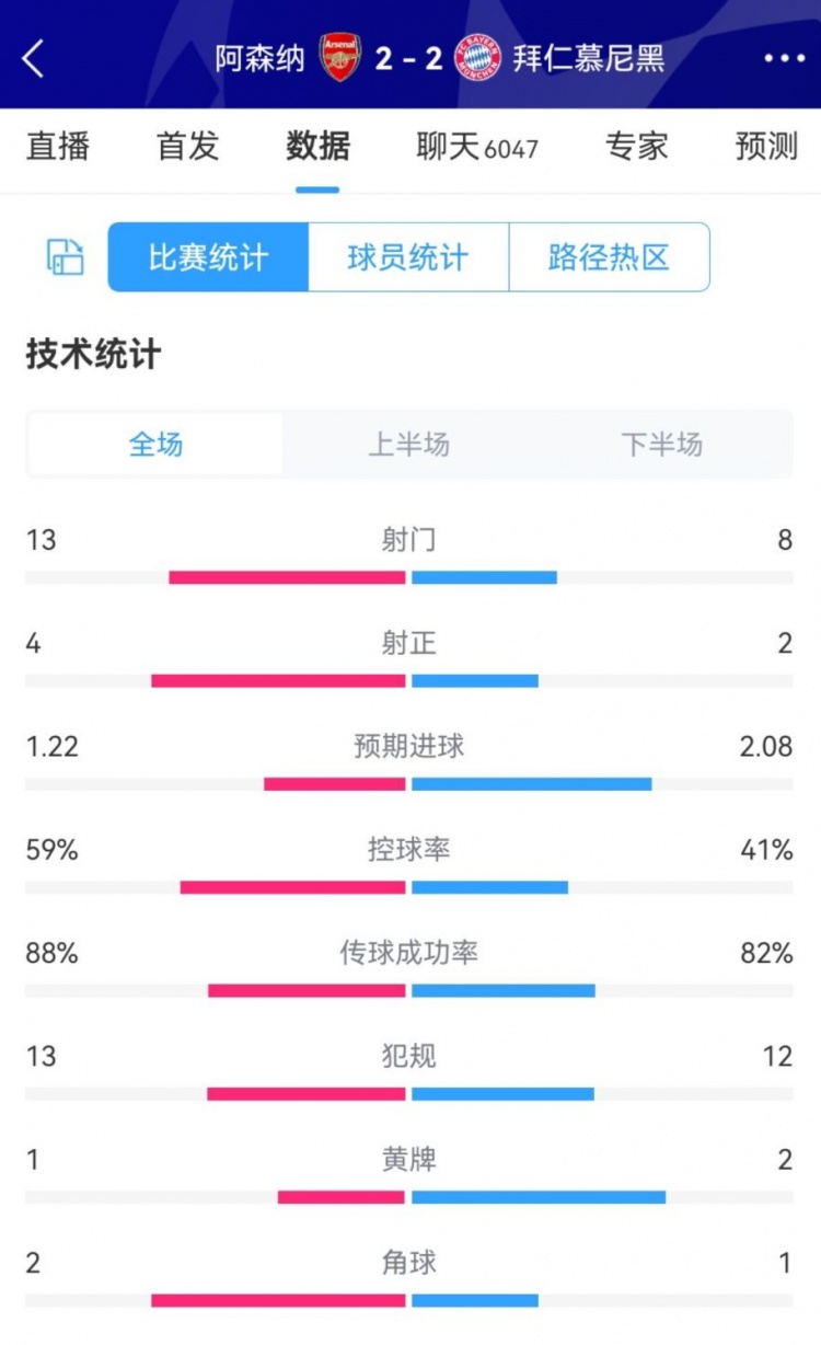 4月10日消息 欧冠1/4决赛首回合,阿森纳2-2拜仁,双方全场数据如图。