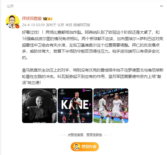 04月10日消息 欧冠1/4决赛,上半场皇马2-1曼城,拜仁2-1阿森纳。著名评述员詹俊做出点评。