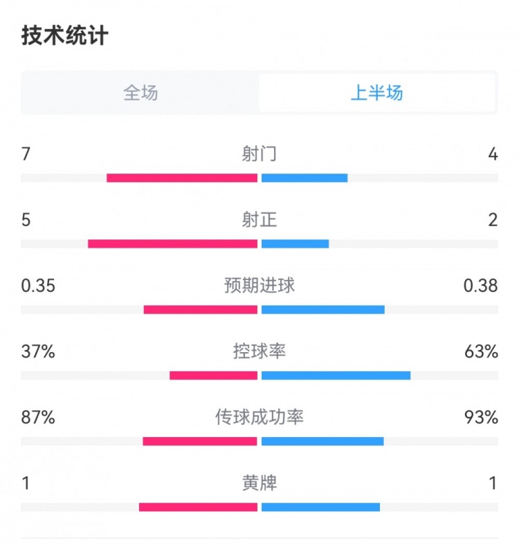 4月10日消息 欧冠八强战1/4决赛首回合,皇马暂2-1半场领先曼城。双方半场数据对比如下↓(主队皇马在前)