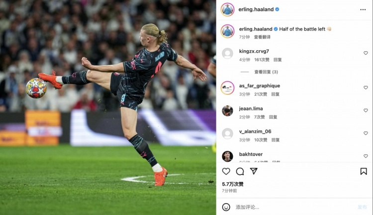 4月11日消息 曼城在欧冠1/4决赛首回合3-3战平皇马,哈兰德更新社交媒体展望次回合。