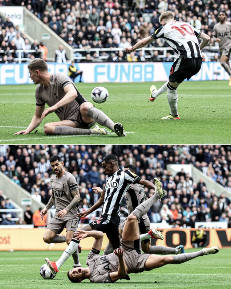 4月14日消息 英超第33轮,纽卡主场4-0横扫热刺,伊萨克双响,戈登2传1射。