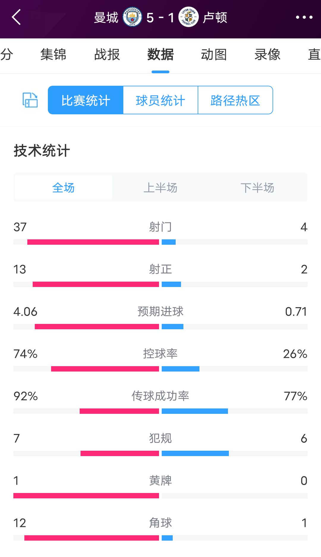 这反差????卢顿前一场对曼城狂射14脚,本场只射4脚+被反轰37脚