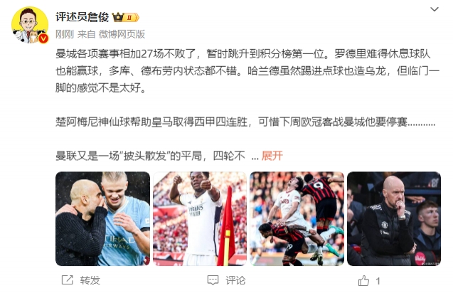 詹俊:曼城各项赛事相加27场不败了,暂时跳升到积分榜第一位。罗德里难得休息球队也能赢球,多库、德布劳内状态都不错。哈兰德虽然踢进点球也造乌龙,但临门一脚的感觉不是太好。