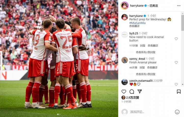 4月14日消息 本轮德甲,拜仁主场2-0科隆。赛后凯恩更新社媒庆祝球队取胜。