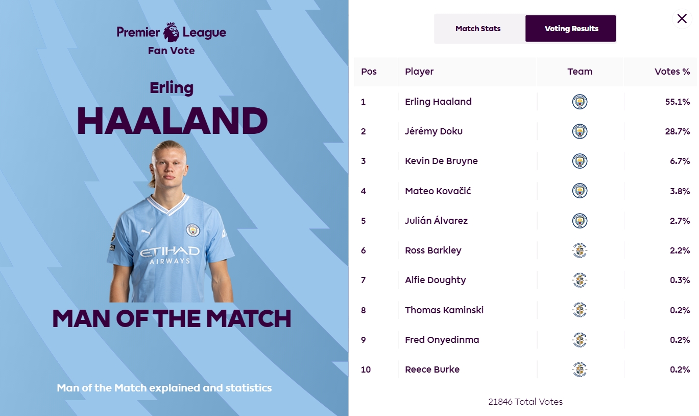 赛后,哈兰德被英超官方评选为本场比赛最佳球员,挪威射手的得票率达到了55.1%,紧随其后的是队友多库,他的得票率为28.7%。