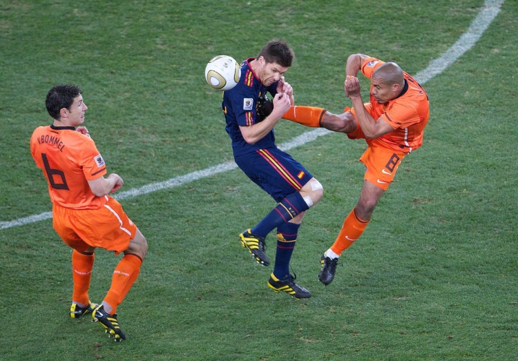 约翰内斯堡的世界杯决赛,阿隆索被德容一脚踹到了胸口。阿隆索坚持到第87分钟被小法换下,多年后,阿隆索依然说:“每次我看到那张图片时,就会隐隐作痛。被击中的那一刻,我忘记了自己身处何地,只听见全身咯吱作响。”