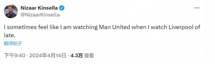 赛后记者Nizaar Kinsella在社交媒体上写道:“最近我看利物浦比赛的时候,有时感觉自己正在看曼联。”