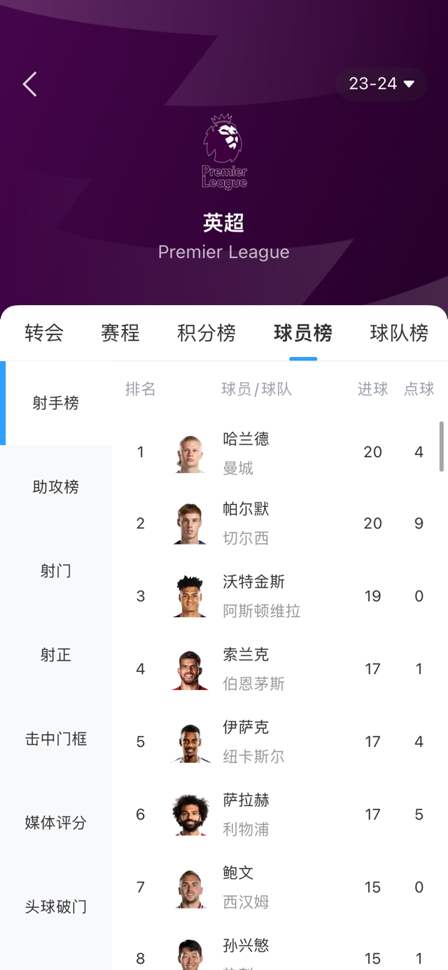 目前的英超射手榜上,帕尔默与哈兰德都打进20球,并列第一。助攻榜帕尔默9次助攻排名第二。