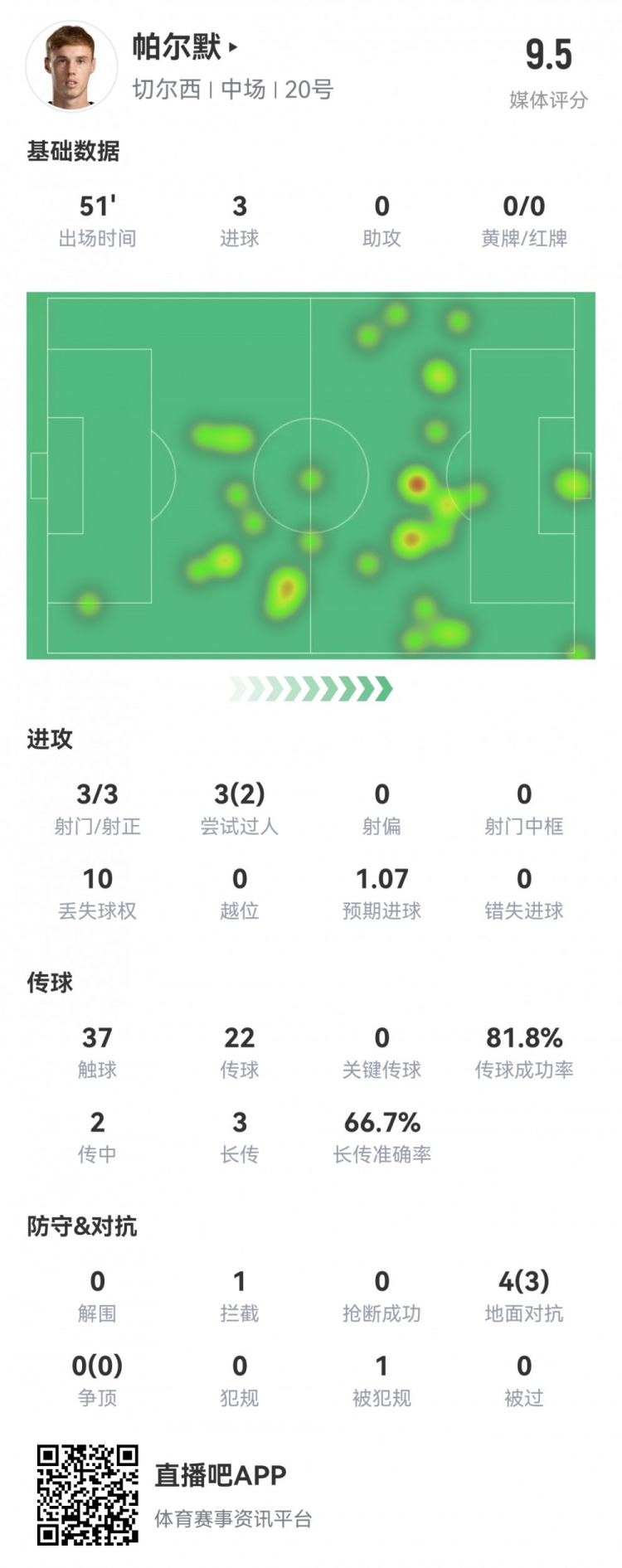 4月16日消息 本轮英超,切尔西主场暂4-0领先埃弗顿。帕尔默上演完美帽子戏法。球员半场重点数据如下↓