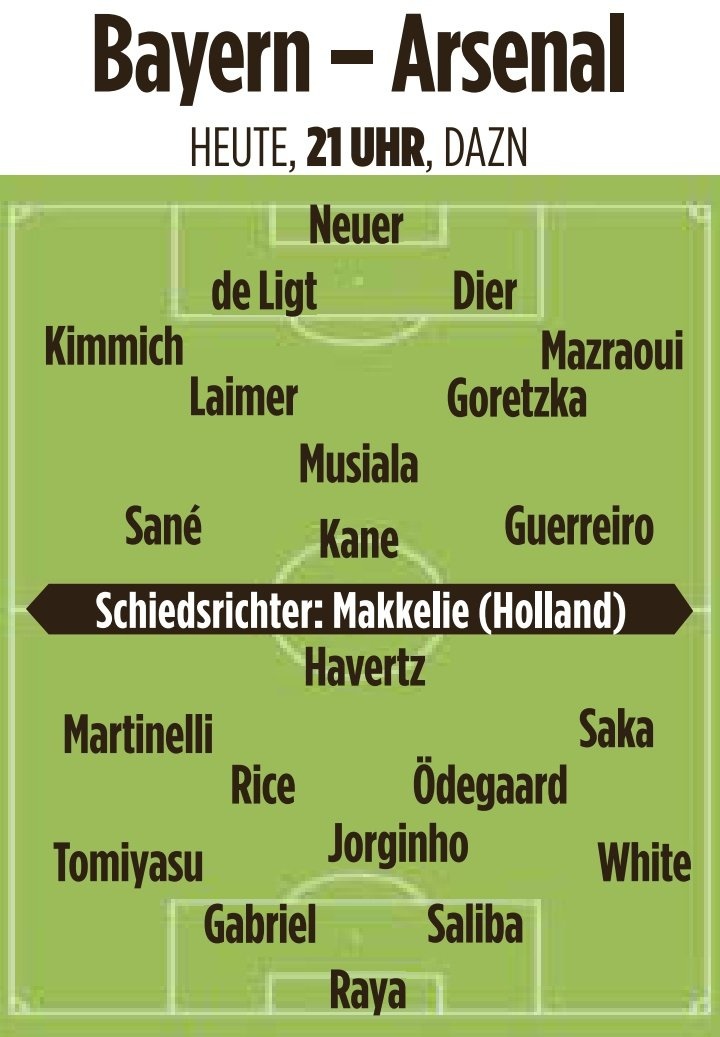 4月17日消息 北京时间明天凌晨,拜仁将在欧冠1/4决赛次回合比赛中主场对阵阿森纳,首回合两队2-2战平,德国媒体《图片报》预测了两队的首发阵容。