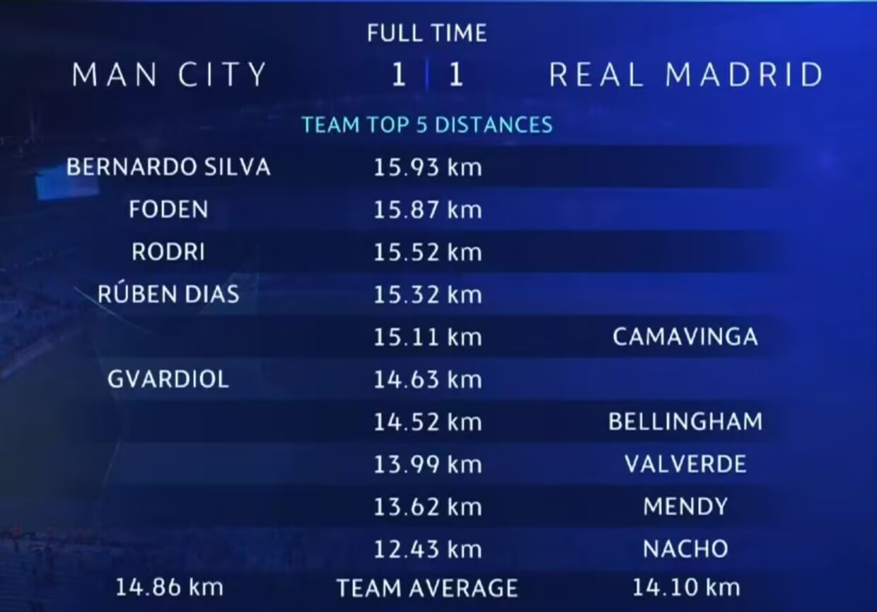 两队平均跑动公里:曼城14.86公里,皇马14.10公里