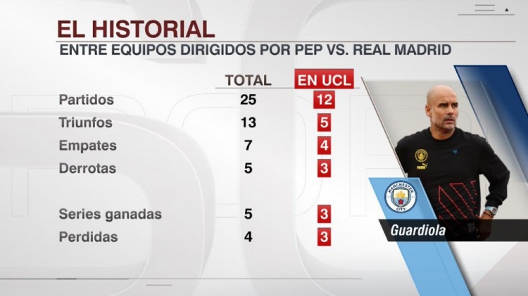 ESPN统计了瓜迪奥拉执教生涯对阵皇马的战绩,他仍以13胜7平5负占优,欧冠则是5胜4平3负。