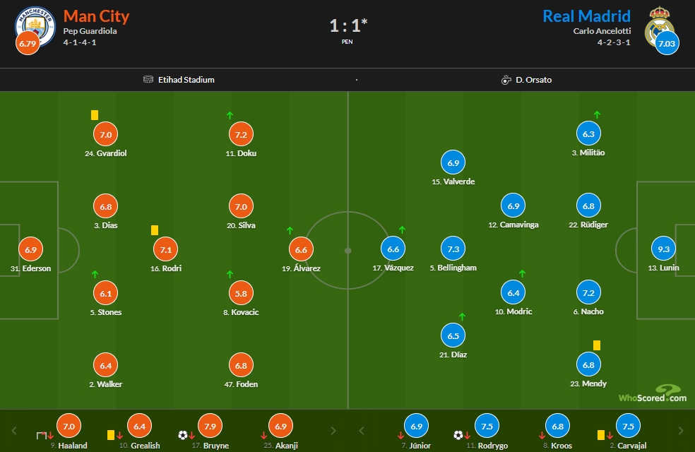 曼城:埃德森6.9、格瓦迪奥尔7.0、迪亚斯6.8、沃克6.4、阿坎吉6.9、罗德里7.1、福登6.8、贝席7.0、格拉利什6.4、哈兰德7.0、德布劳内7.9、科瓦西奇5.8、多库7.2、斯通斯6.1、阿尔瓦雷斯6.6