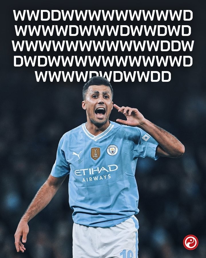 Squawka统计表明,罗德里近67次代表曼城出战保持不败,战绩51胜16平。
