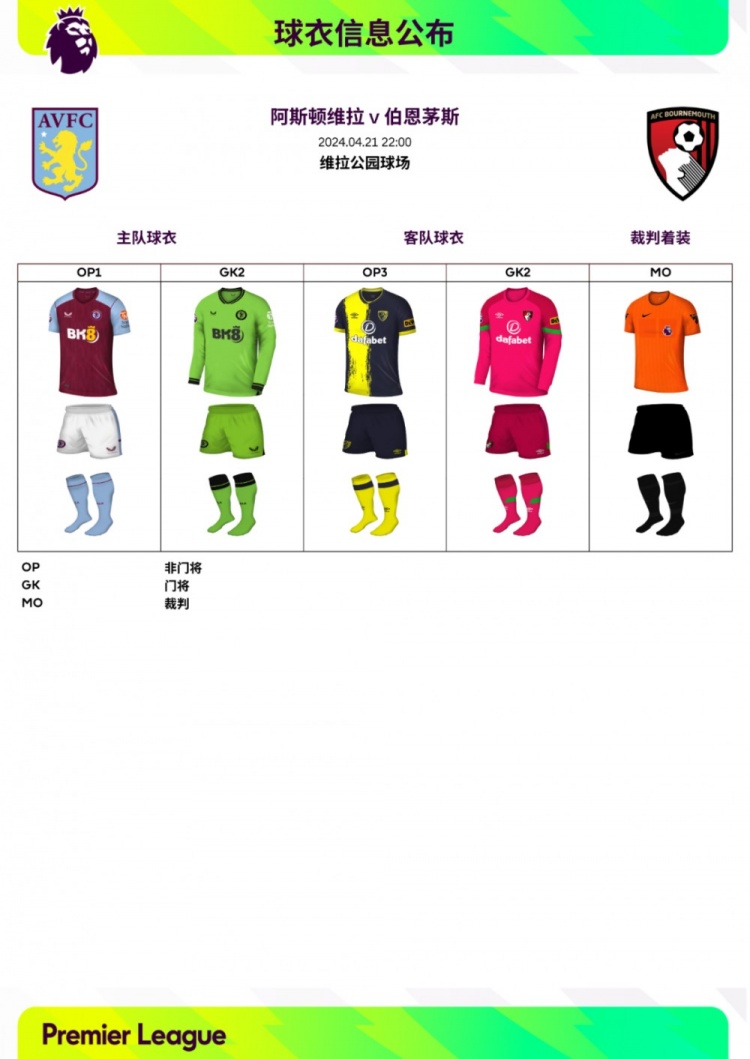 4月20日消息 英超联赛官方公布了第34轮比赛各队的球衣信息,阿森纳、利物浦将身穿主场球衣出战客场比赛。